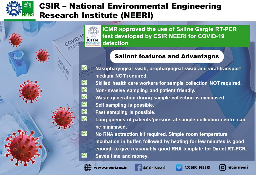 कोविड-19 महामारीचा जगभर उद्रेक झाल्यापासूनच, भारतात या आजाराच्या चाचण्या करण्यासाठीच्या पायाभूत क्षमता आणि चाचणी क्षमता वाढवण्यासाठी विविध स्तरांवरुन प्रयत्न सुरु आहेत. नागपूरची राष्ट्रीय पर्यावरण अभियांत्रिकी संशोधन संस्था (नीरी) ने वैज्ञानिक आणि औद्योगिक संशोधन परिषद (CSIR) च्या मार्गदर्शनाखाली, या चाचण्यांच्या संशोधन प्रवासात आणखी एक मैलाचा दगड गाठला आहे. या संस्थेने कोविड-19 च्या नमुना चाचणीसाठी ‘मिठाच्या पाण्याच्या गुळण्यातून होणारी आरटी-पीसीआर पद्धत’ शोधून काढली आहे.